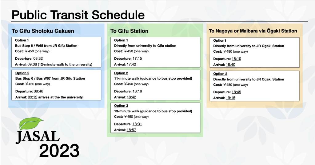 If you’ll be making your own way there, please refer to the schedule below for public buses. Please be careful not to get off at Gifu Campus. You need to stay on the bus until you reach Hashima Campus (if taking the direct bus). Please note that there is no chartered bus heading back to Gifu station after the conference. Please use the public transport options posted below.